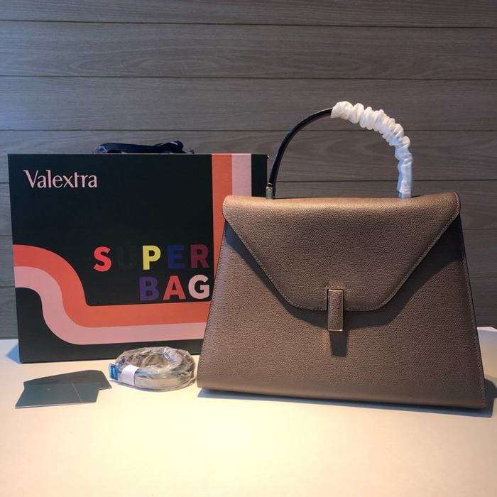 This grey Valextra bag is crafted from signature textured leather, offering a minimalist silhouette and timeless elegance