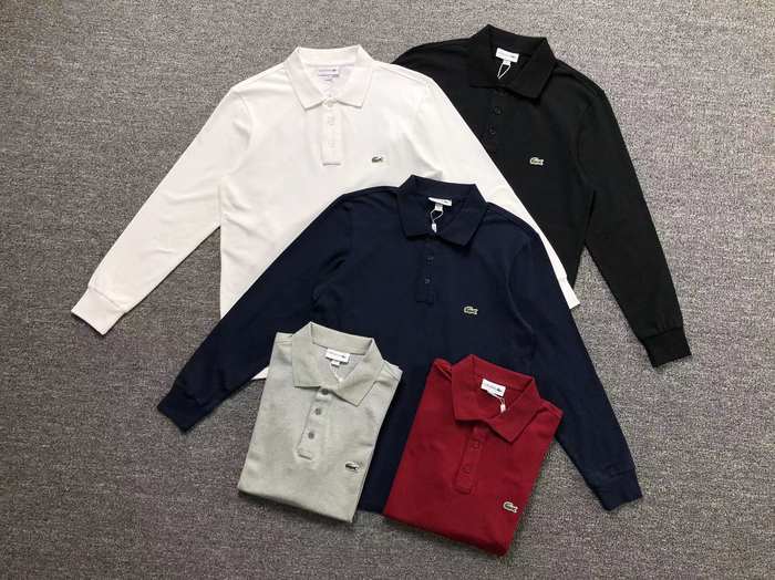 Elevate your style with the Lacoste long sleeve polo shirt available in White, Black, Navy Blue, Gray, and Red—perfect for any casual occasion.