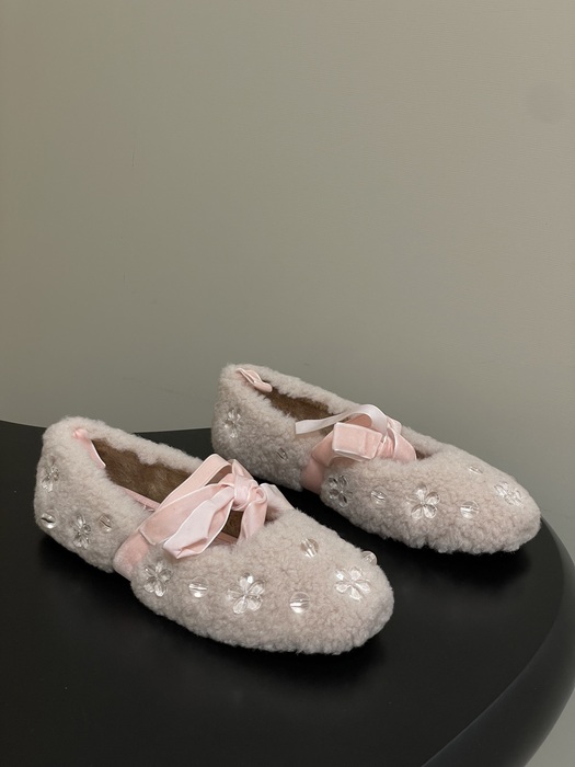 These Miu Miu shearling and rhinestone flat shoes offer a blend of comfort and luxury. Available in sizes 35 to 40, the design features soft shearling lining and elegant rhinestone accents Yupoo Top quality